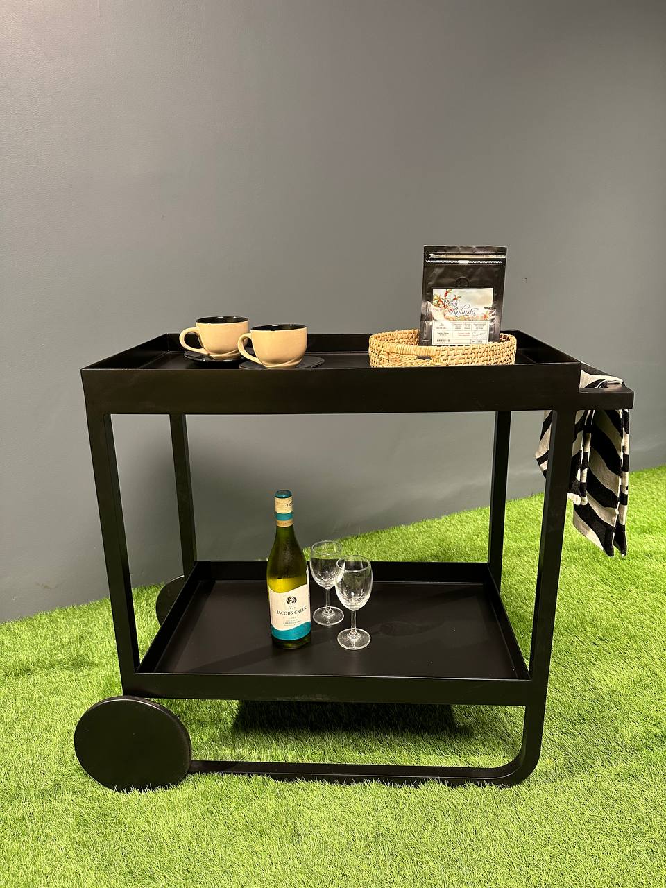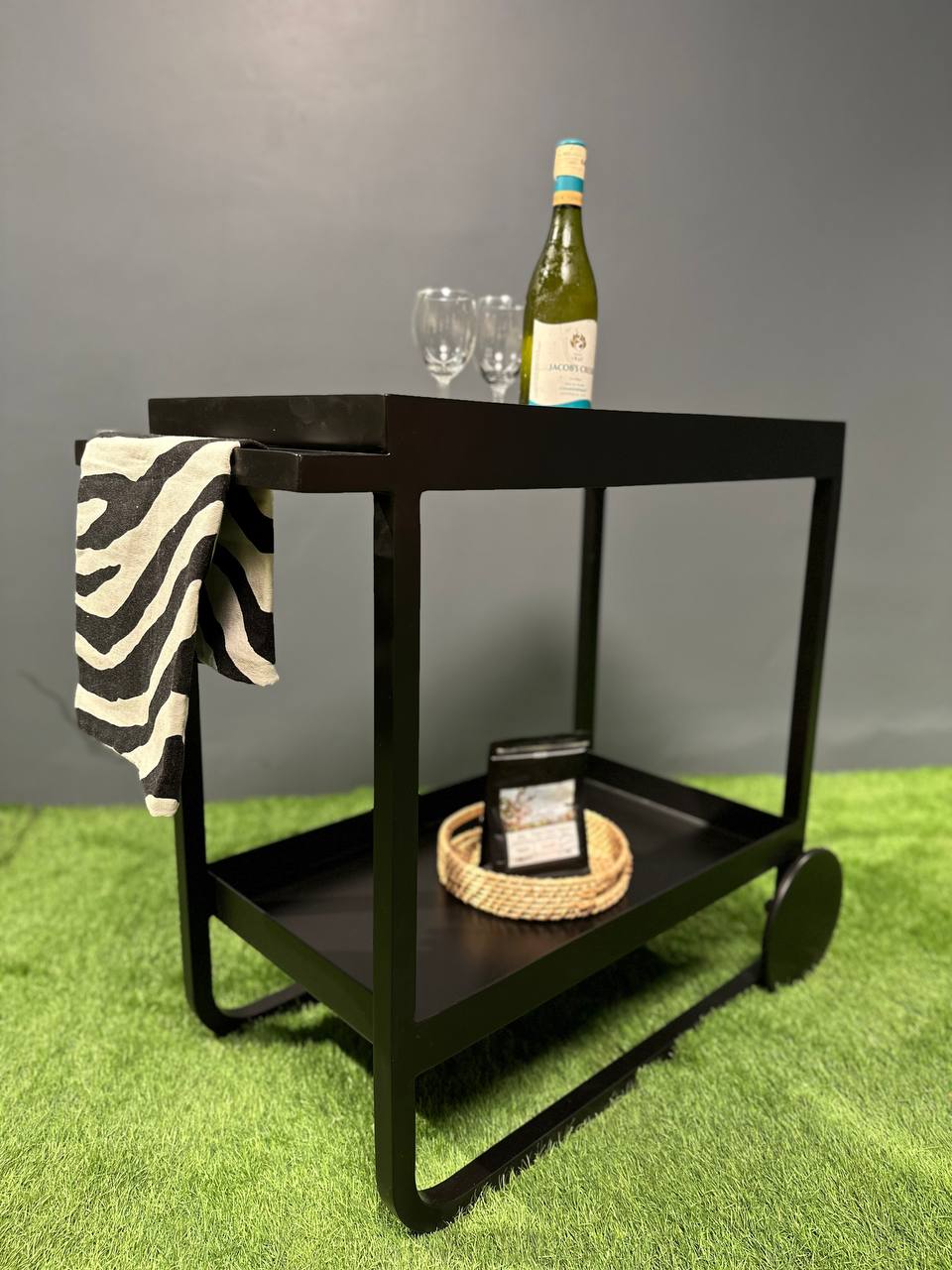 The Essan Trolley features a minimalist design characterized by its clean lines and sturdy construction. The black metal frame exudes a modern and sophisticated look, with a matte finish that enhances its visual appeal. The two-tier design provides ample space for storage and display, while the integrated handle and large wheels ensure ease of movement. The sleek design ensures that the Essan Trolley complements any decor, adding a touch of elegance to any setting.