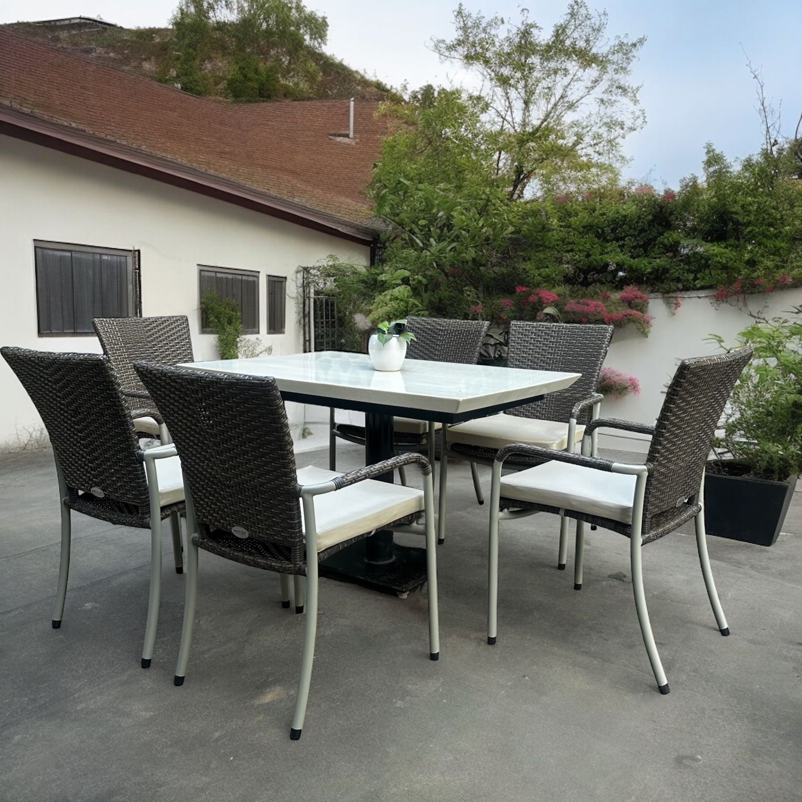 Durable Materials: Constructed from robust materials such as powder-coated aluminum for the frames and synthetic wicker for the woven elements, the Geneva Dining Set is built to withstand outdoor conditions. The materials ensure longevity and minimal maintenance.